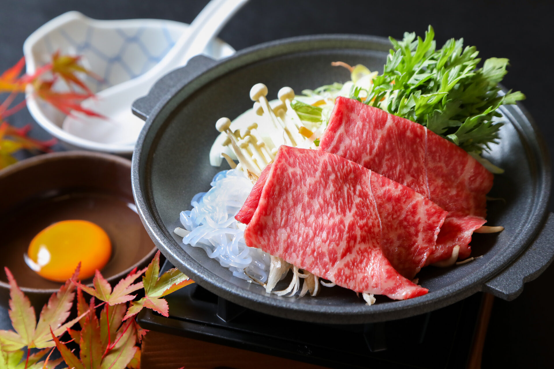 牛の旨味と甘さが堪能できる、すき焼きのコースです。卵に絡めて味わう肉の旨みは格別です。野菜と一緒に煮込むことで、味わい深さが引き立ちます。
